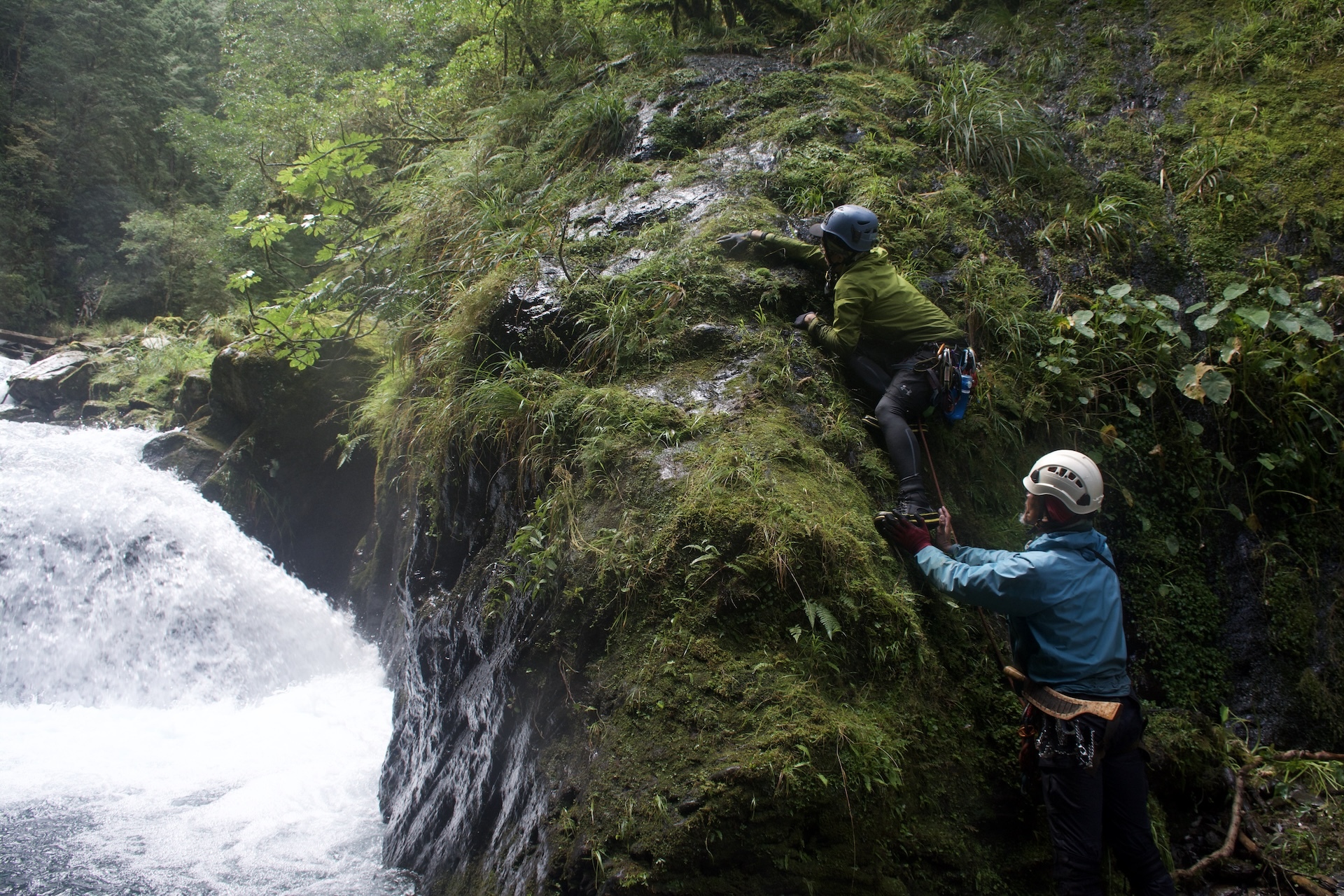 我們收緊隊形,我率先打頭陣,隊員在後面確保。峽谷裡有一段瀑布狹槽,水流急促到讓人呼吸變得困難。我們先將背包用拋繩拉到上方的安全點,再依序攀上濕滑的岩壁。腳尖嵌進石縫,手指緊扣岩棱,耳邊的水聲像在催促:快點、快點。