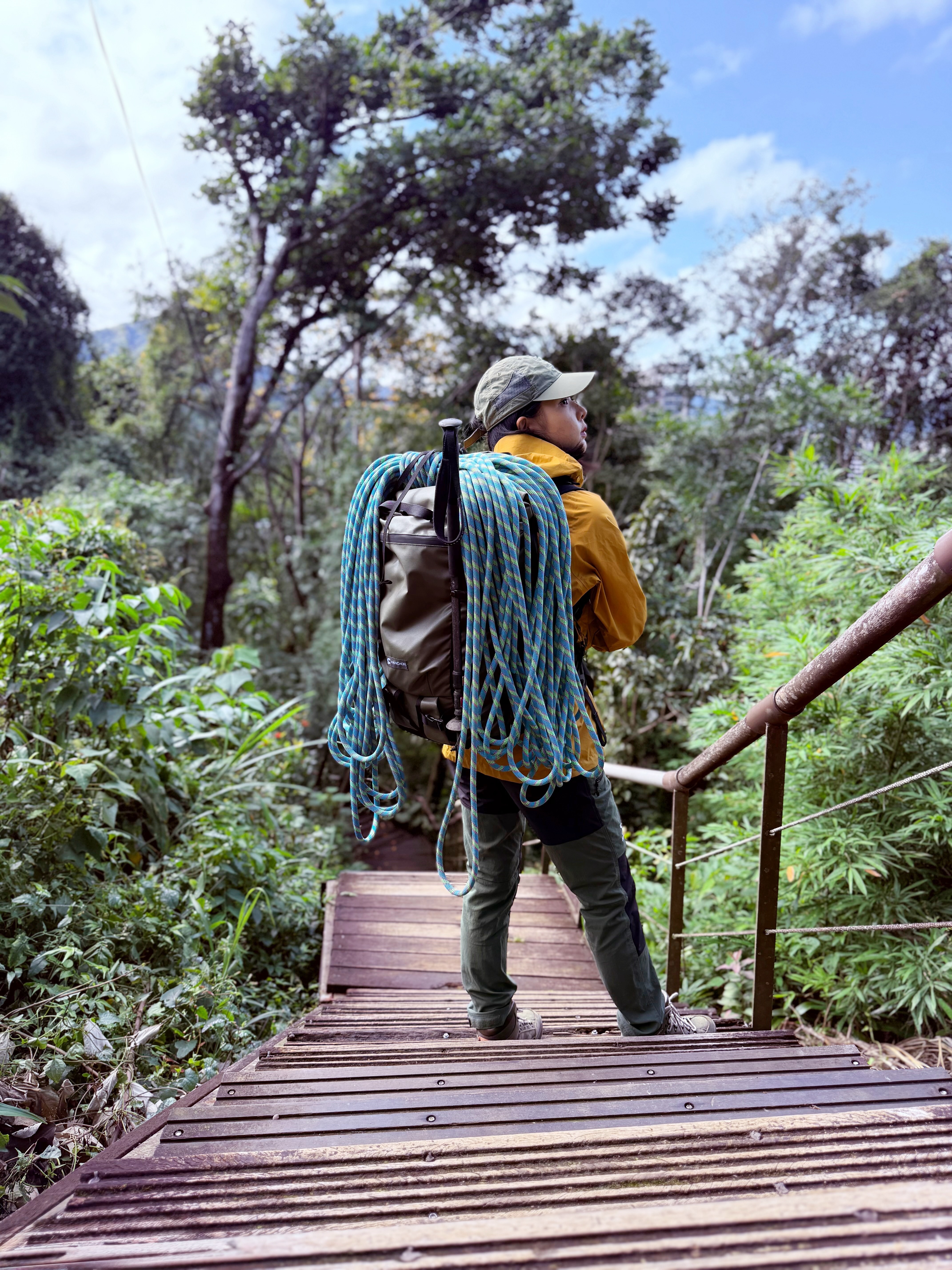包身外部兩條Daisy Chain,配合繩具扣件可以外掛裝備,我常用兩條綑紮帶固定繩子在背包上方,很穩。之前買的各式Hanchor配件也可以沿用,像是岩盔也可以搭配上前陣子新出的網袋外掛。
