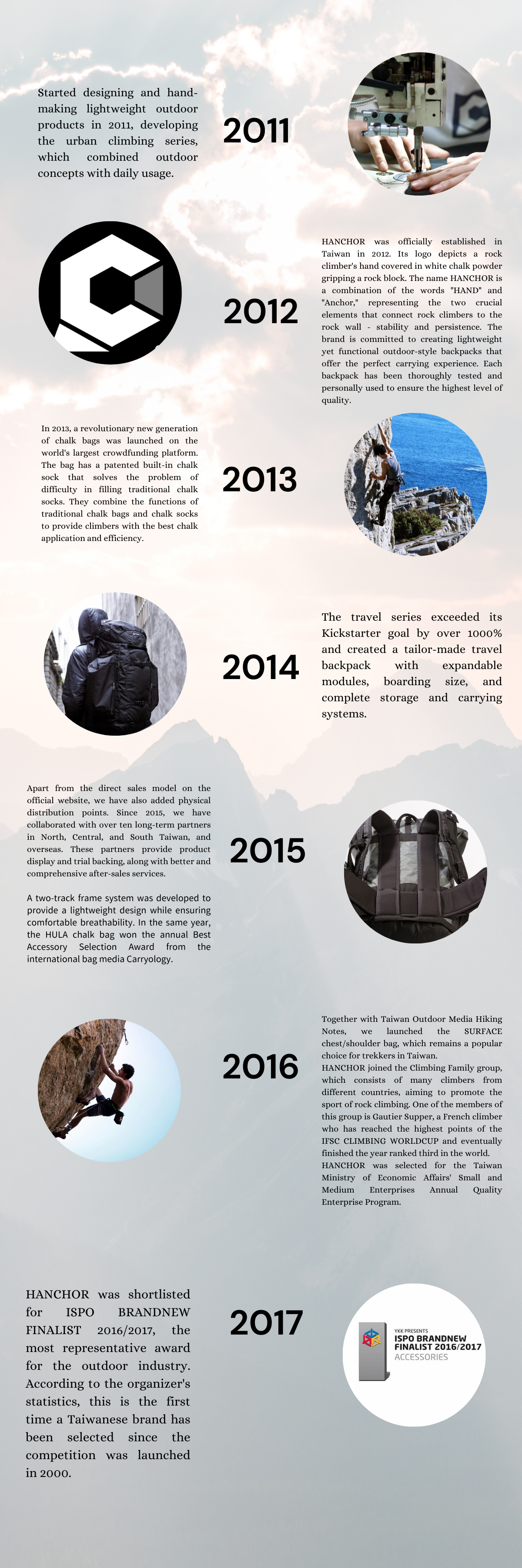 The HANCHOR brand was created in Taipei, Taiwan in 2012. We have been designing and making bags for outdoor adventures since 2010, and our logo symbolizes a chalked hand with a solid grip on a hold. HANCHOR = Hand+Anchor, both of which keep us on the wall when we climb, and our mission is to design innovative, simple, and high-quality bags to hold your stuff for all your adventures.