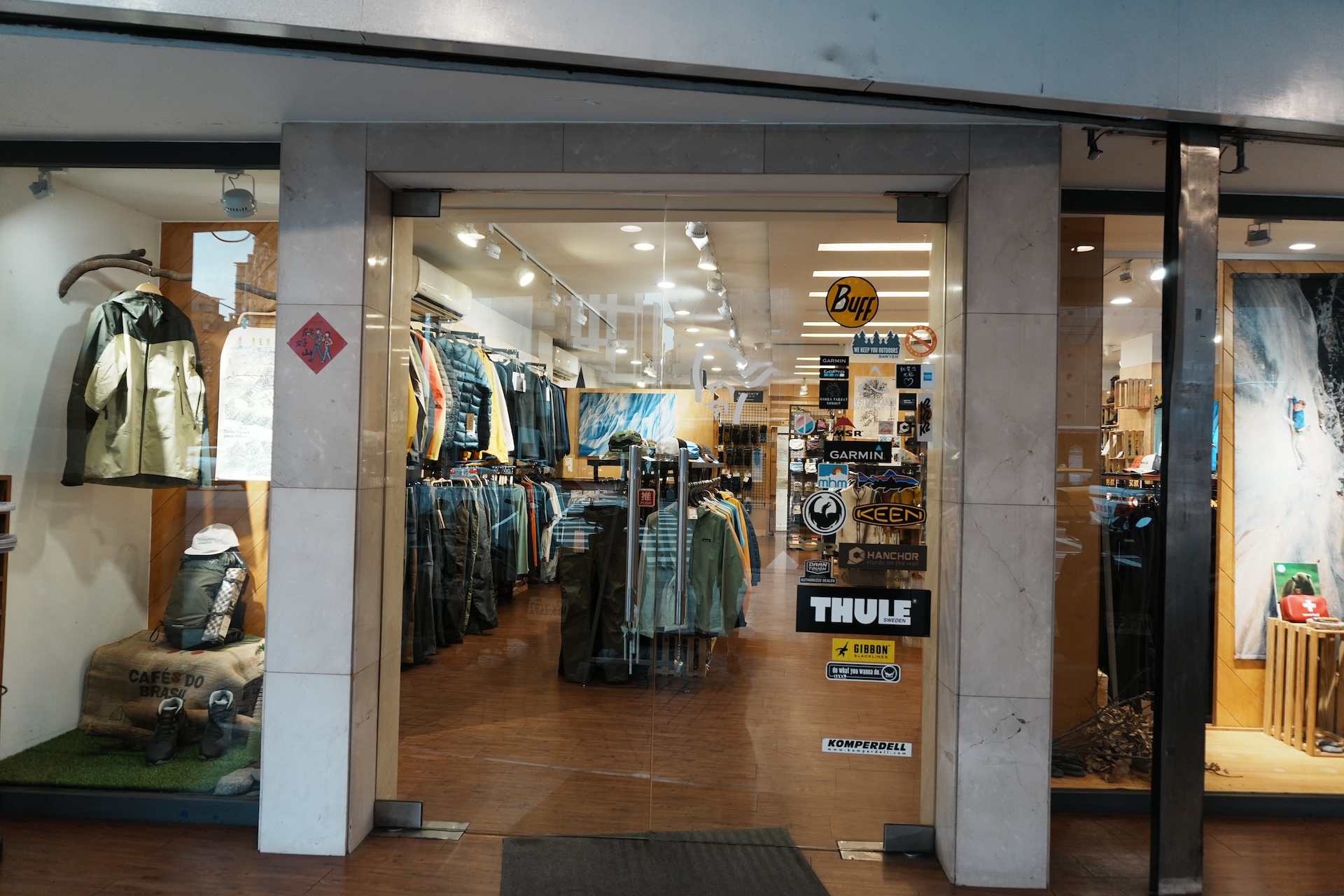 登山補給站共有兩層樓,一樓及B1。一樓擺放與戶外服飾類相關的物品,底層衣、中層保暖、防水外套、羊毛襪等等。